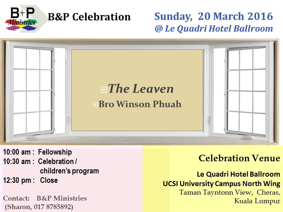The LeavenB&P MinistriesMar 18, 20161 min read Sun. 20 March 2016, 10 am,. Le Quadri Hotel Ballroom, K.L.