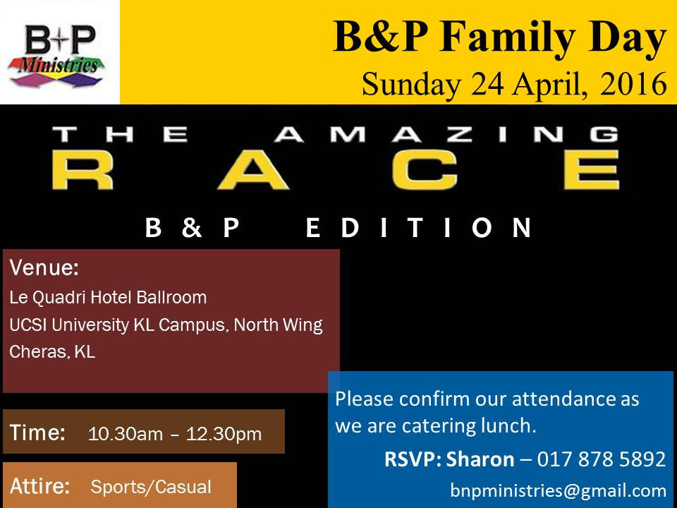The Amazing RaceB&P MinistriesApr 22, 20161 min read Sun. 24 April, 10:30 am, Le Quadri Hotel Ballroom